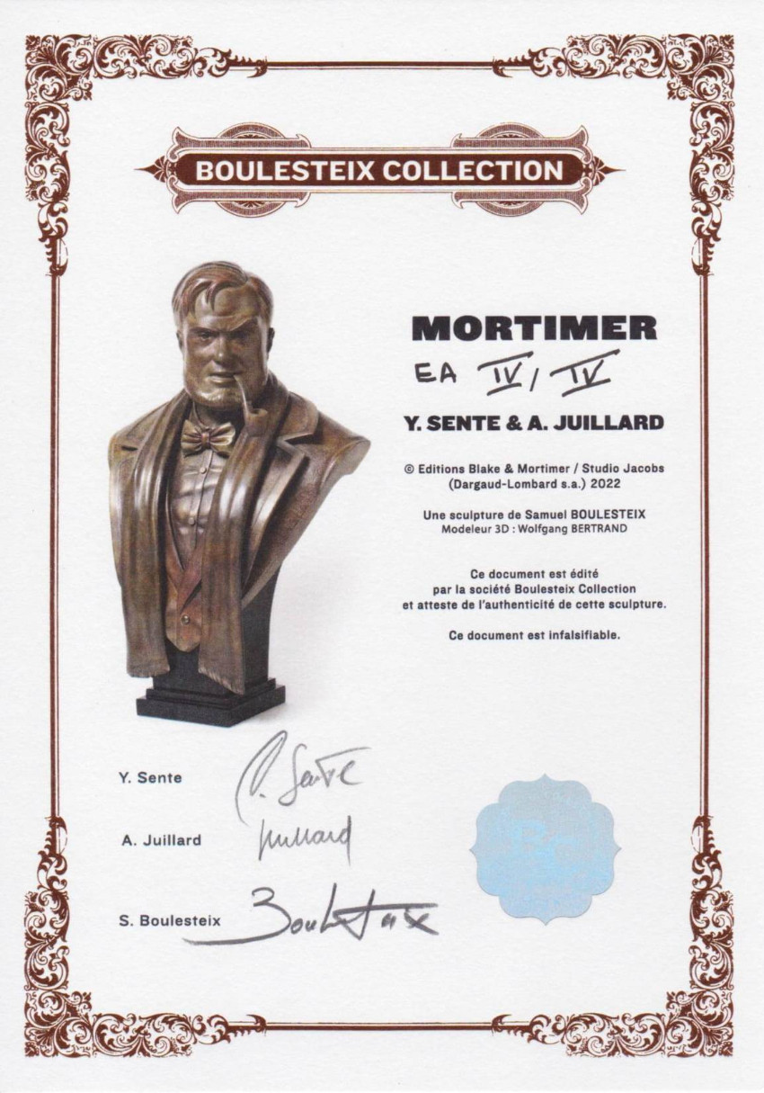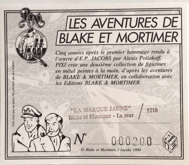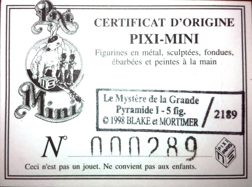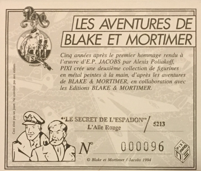 Commentaire : Pas de justificatif de tirage. On peut par contre parfois trouver un "certificat d'authenticité Pixi" à l'intérieur (visuel 2). Boîte Kraft. Sous le socle est gravé "PIXI E.P JACOBS Blake et Mortimer 1990".