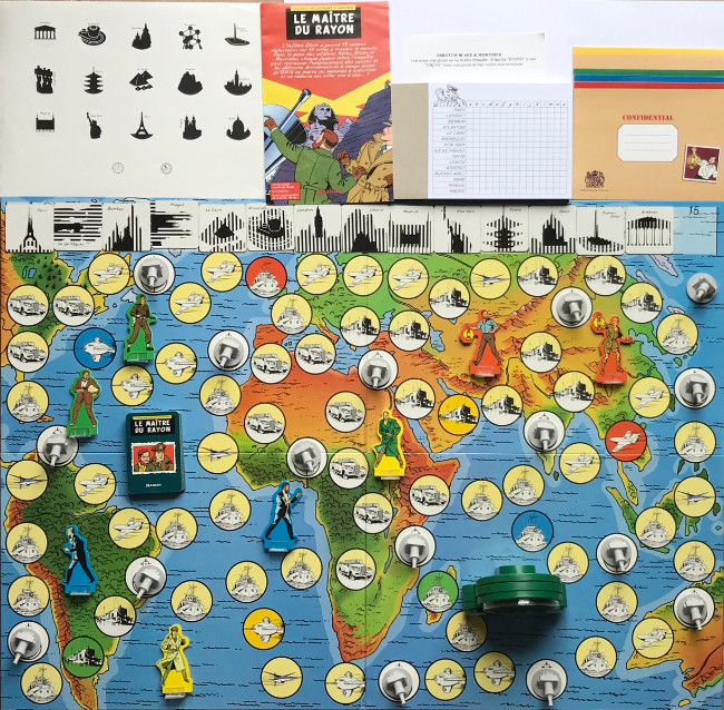 Commentaire : Contient : 1 plateau de jeu 8 pions et 8 socles 16 canons réducteurs 1 planche de 15 autocollants 33 cartes 1 bloc de feuilles d’enquête 4 dossiers " Confidential " 1 détecteur de rayon 15 cartes " ville objectif " 1 règle du jeu