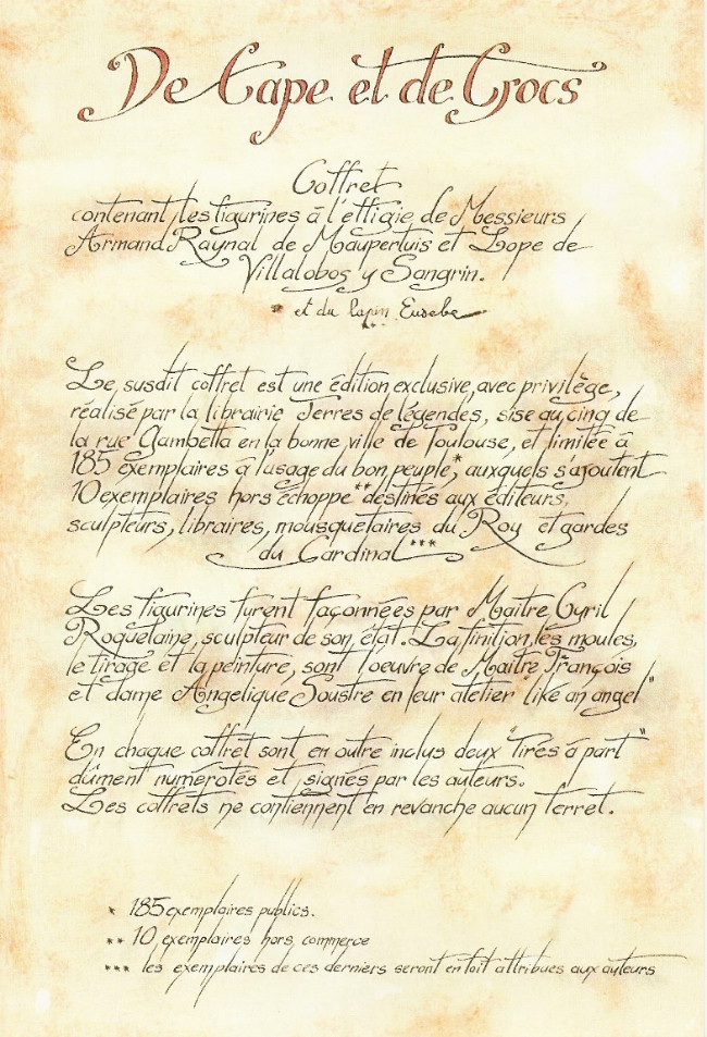 Commentaire : Ensemble de 3 figurines livrées dans une boite en bois (dimensions 120 x 220 x 120). Certificat roulé comme un parchemin. La boite contient aussi 2 tirés à part numérotés et signés.