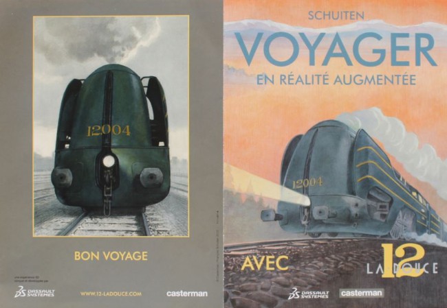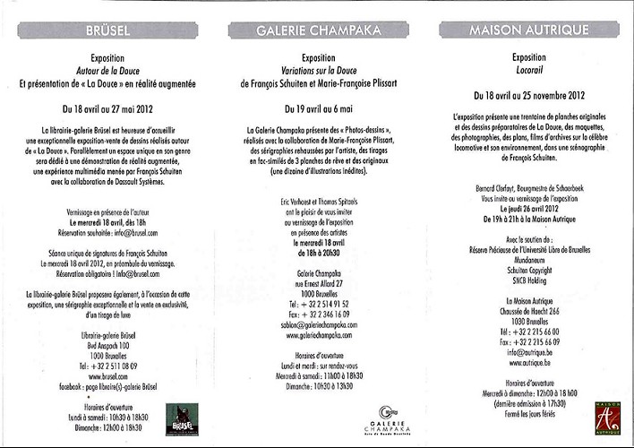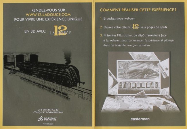 Commentaire : Flyer accompagnant la première édition de l'album 12 La Douce indiquant la procédure pour accéder à la fonction de réalité augmentée sur le site de l'album (www.12-ladouce.com) afin de plonger dans l'univers de Schuiten en 3D. Flyer recto-verso plié en deux.