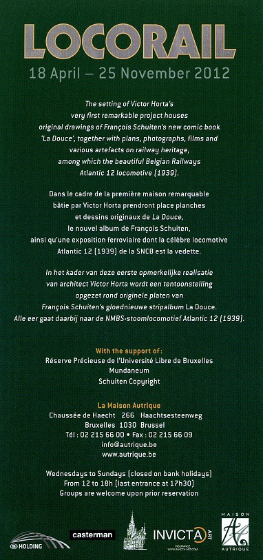 Commentaire : Exposition ferroviaire Locorail du 18 avril au 25 novembre 2012 à Bruxelles (Belgique). Flyer recto-verso.