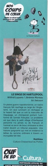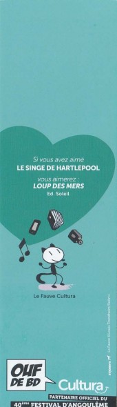 Commentaire : Fait partie d'une série de 8 marques page "Nos coups de cœur" émis par Cultura à l'occasion du festival d'Angoulême 2013. Autres marques page : Daytripper, Pablo T2, L'enfance d'Alan, Tu mourras moins bête T2, Walking Dead T16, Les Folies Bergère, Moi René Tardi prisonnier de guerre au stalag IIB.