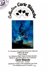 Commentaire : Carte à jouer numérotée et signée, faisant partie d'un ensemble de 54 cartes nommé "Carte Blanche - Première donne". Ces cartes sont éditées à 100 exemplaires chacune, sont liées à un album précis et 1 carte supplémentaire est réservée aux abonnés à la collection. Ces cartes sont mises dans la catégorie Carte (et non Jeux) car reliées spécifiquement à un album dans lequel est inséré un certificat correspondant à la carte portant le même numéro.