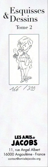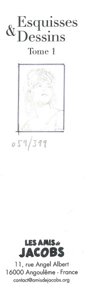 Commentaire : Fourni avec le tome 1 de "Esquisses et dessins". Tirage limité de 399 exemplaires numérotés. Le numéro est le même que celui de l'album.