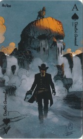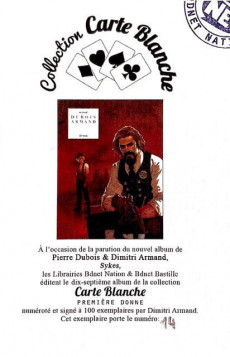 Commentaire : Carte à jouer numérotée et signée, faisant partie d'un ensemble de 54 cartes nommé "Carte Blanche - Première donne" : 53, éditées à 100 exemplaires chacune, sont liées à un album précis et 1 supplémentaire est réservée aux abonnés à la collection. Ces cartes sont mises dans la catégorie Carte (et non Jeux) car reliées spécifiquement à un album.