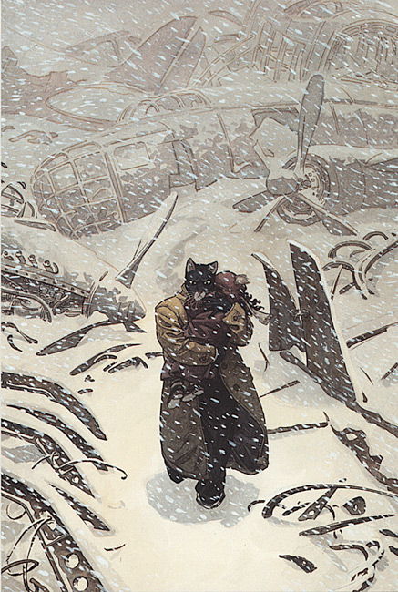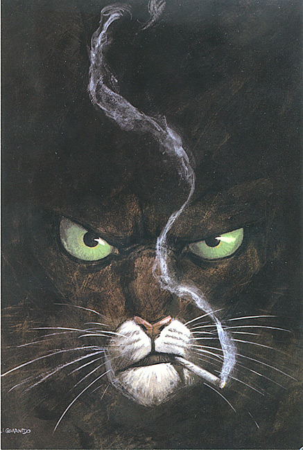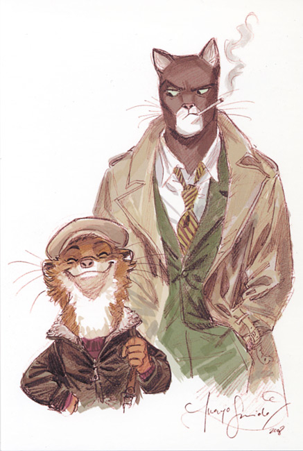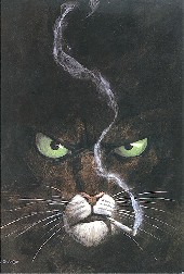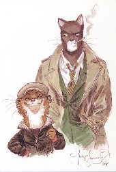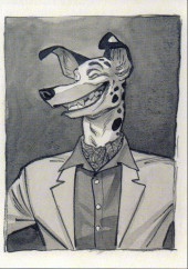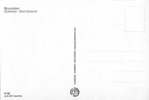 Commentaire : Titré "Blacksad". Fait partie des 18 cartes postales contenues dans le portfolio. Existe avec une variante au verso (flashcode à la place de la zone timbre : cette série de cartes est éditée à 2000 exemplaires en septembre 2010, contre 1000 pour la première édition du portfolio en janvier 2010), le contenu du portfolio reste identique.