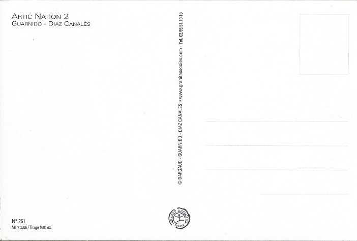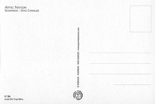 Commentaire : Titrée "Artic nation". Référencé chez Granit associé comme le n°261, mais noté sur la carte 264. Fait partie des 18 cartes postales contenues dans le portfolio. Existe avec une variante au verso (flashcode à la place de la zone timbre : cette série de cartes est éditée à 2000 exemplaires en septembre 2010, contre 1000 pour la première édition du portfolio en janvier 2010), le contenu du portfolio reste identique.