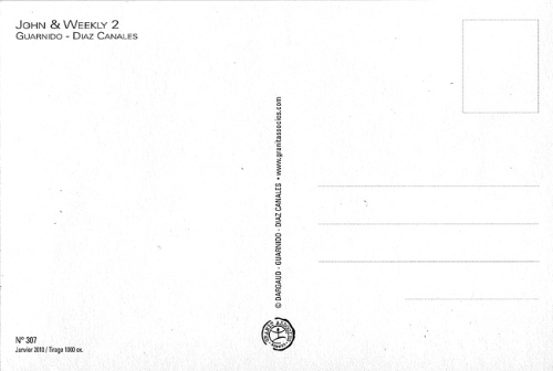 Commentaire : Titrée "John & Weekly 2". Fait partie des 18 cartes postales contenues dans le portfolio. Existe avec une variante au verso (flashcode à la place de la zone timbre : cette série de cartes est éditée à 2000 exemplaires en septembre 2010, contre 1000 pour la première édition du portfolio en janvier 2010), le contenu du portfolio reste identique.