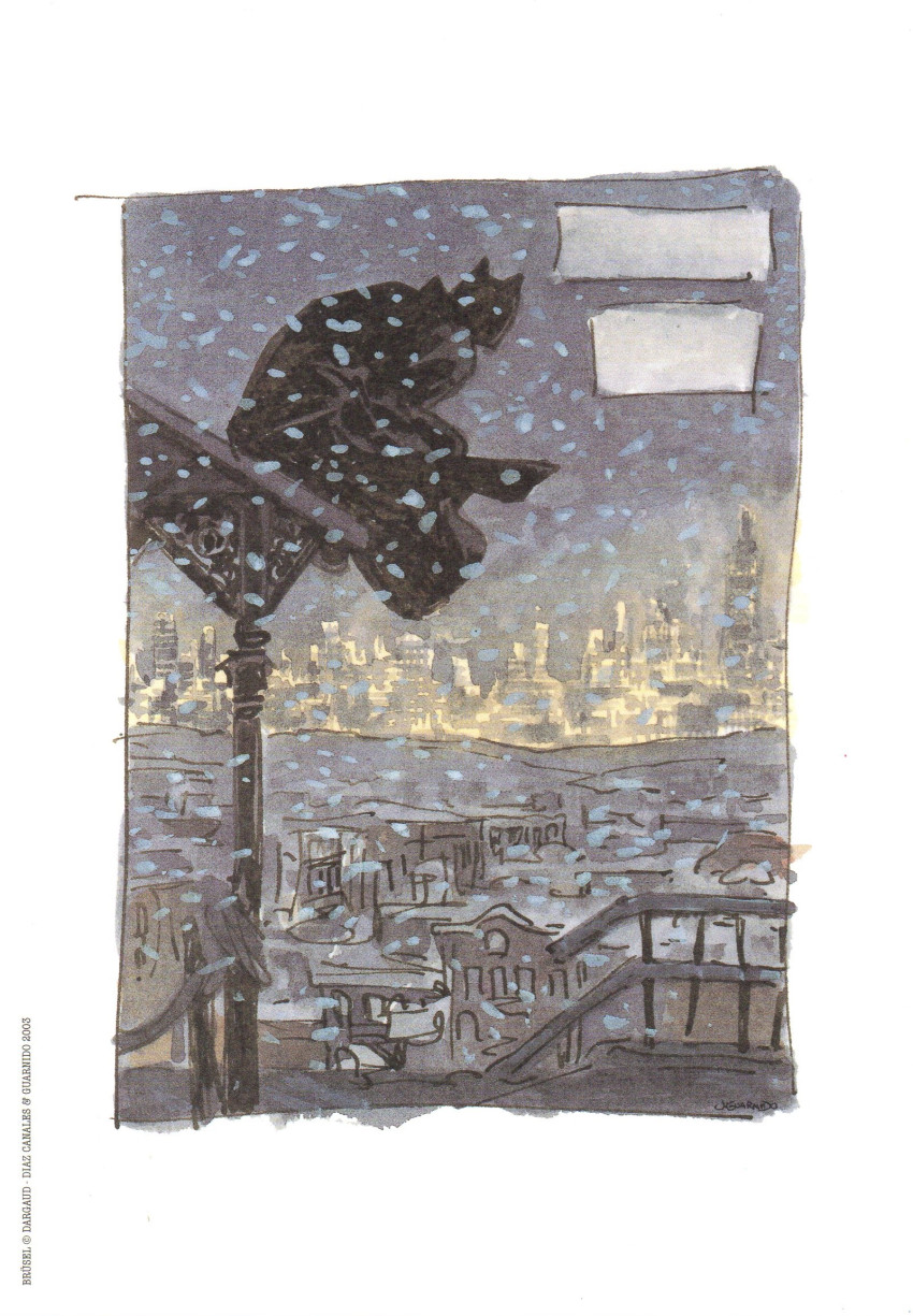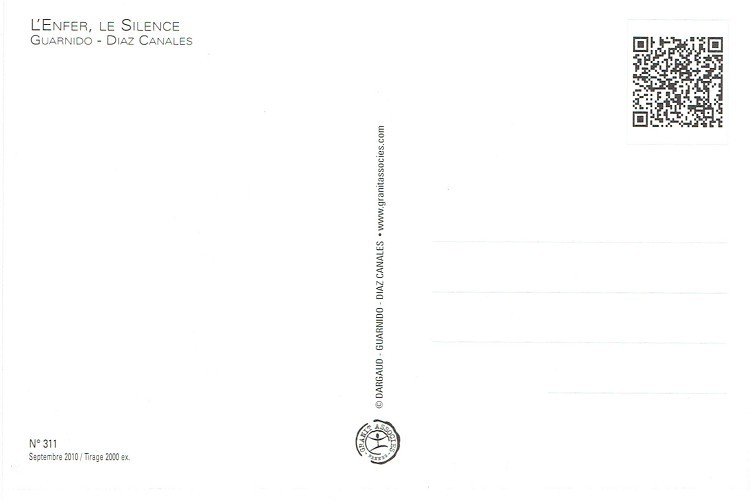Commentaire : Titrée "L'Enfer, Le Silence". Fait partie des 18 cartes postales contenues dans le portfolio. Existe avec une variante au verso (zone timbre à la place du flashcode : cette série de cartes est éditée à 1000 exemplaires en janvier 2010, contre 2000 pour la deuxième édition du portfolio en septembre 2010), le contenu du portfolio reste identique.