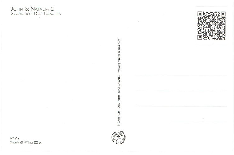 Commentaire : Titrée "John et Natalia". Fait partie des 18 cartes postales contenues dans le portfolio. Existe avec une variante au verso (zone timbre à la place du flashcode : cette série de cartes est éditée à 1000 exemplaires en janvier 2010, contre 2000 pour la deuxième édition du portfolio en septembre 2010), le contenu du portfolio reste identique.