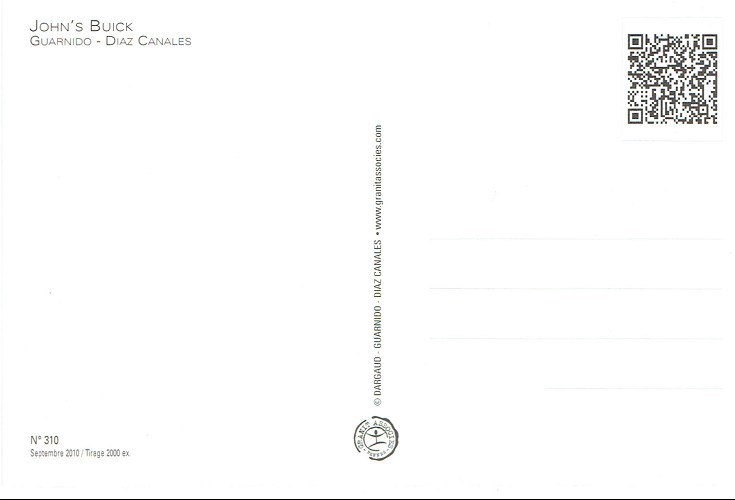 Commentaire : Titrée "John's Buick". Fait partie des 18 cartes postales contenues dans le portfolio. Existe avec une variante au verso (zone timbre à la place du flashcode : cette série de cartes est éditée à 1000 exemplaires en janvier 2010, contre 2000 pour la deuxième édition du portfolio en septembre 2010), le contenu du portfolio reste identique.