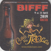 Commentaire : Sous-bock du Festival du Film Fantastique de Bruxelles - le Brussels International Fantastic Film Festival (BIFFF) - du 9 au 21 avril 2019 illustrée par un dessin inédit de David P. Le verso représente la cuvée des Trolls, bière de la Brasserie Dubuisson.