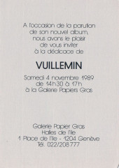 Commentaire : Invitation pour la dédicace du dernier album de VUILLEMIN le samedi 4 novembre 1989 à la Galerie Papiers Gras à Genève
