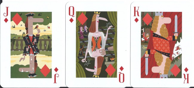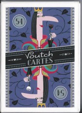 Commentaire : Jeu de 54 cartes format US dessiné par Voutch ainsi que son fourreau. Les valets, reines et rois ont la particularité d'avoir un double sens de lecture en arrière plan.