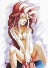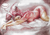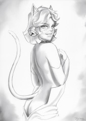 Commentaire : Illustration imprimée recto-verso (un côté en couleur, l'autre au crayon). Fait partie d'une série de 6 illustrations (5/6) au format A4 formant le portfolio sensuel "Olé Kitten" offert aux contributeurs du financement participatif Ulule à partir du palier à 80€ pour le tome 1 "Un nouvel horizon". Sans contenant.
