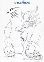 Commentaire : Illustration imprimée recto-verso (un côté en couleur, l'autre au crayon). Fait partie d'une série de 6 illustrations (6/6) au format A4 formant le portfolio sensuel "Olé Kitten" offert aux contributeurs du financement participatif Ulule à partir du palier à 80€ pour le tome 1 "Un nouvel horizon". Sans contenant.