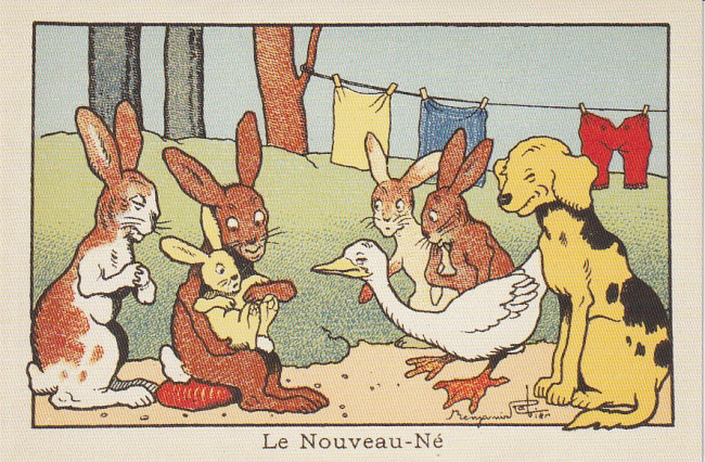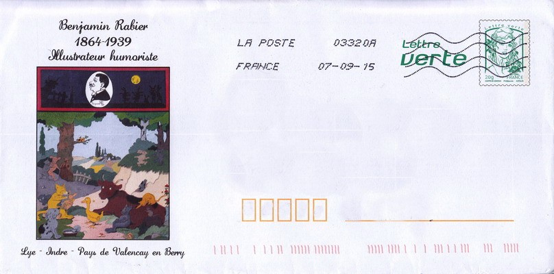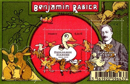 Commentaire : Bloc de 2 timbres à 0,66 et 1,10€ en hommage à Benjamin Rabier, à l'occassion du 150e anniversaire de sa naissance, avec un premier timbre illustrant son portrait gravé en taille-douce et un second timbre avec son fidèle compagnon : le canard Gédéon. Dessin : Sophie Beaujard. Gravure : Pierre Bara.