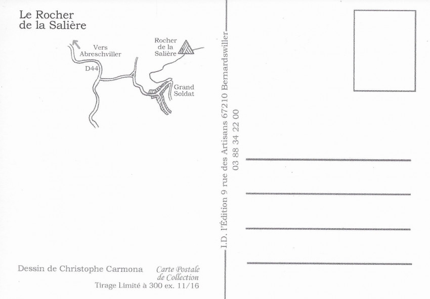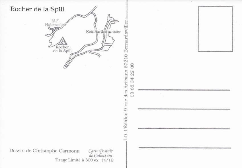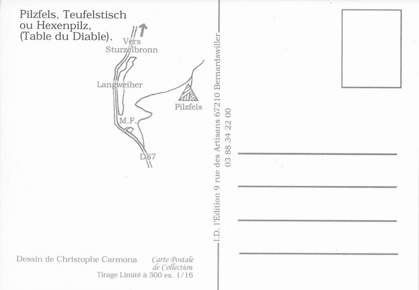 Commentaire : Fait partie d'une série de 16 cartes postales tirage limité à 300 exemplaires. Chaque visuel est tiré de l'ouvrage Rochers Fantastiques d'Alsace.
