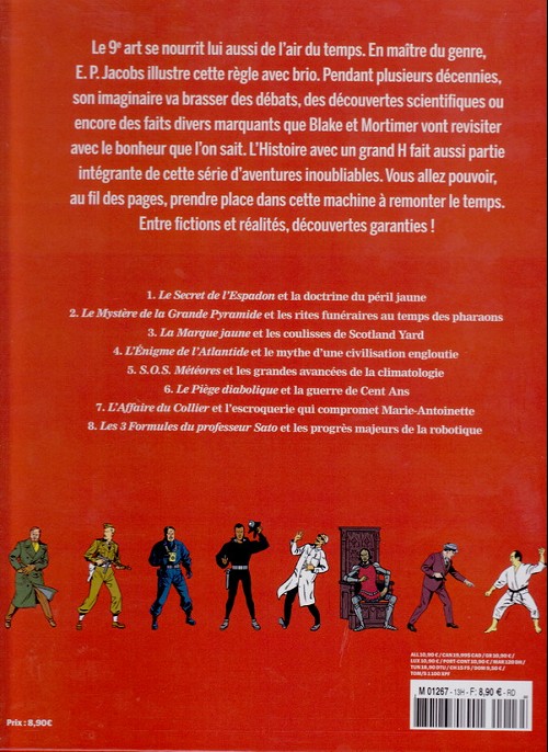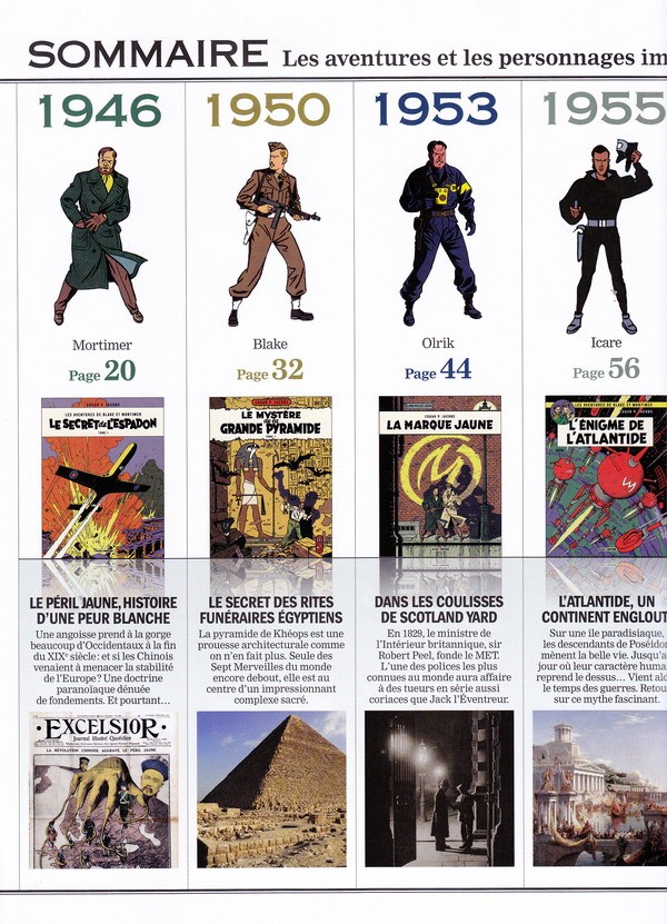 Sommaire : Les Personnages de Blake et Mortimer dans l'Histoire est une publication proposée par Sophia Publications (Historia) avec Le Point pour la France et La Libre Belgique pour la Belgique. Ce hors-série existe donc en trois versions, dont celle-ci pour la Belgique avec La Libre Belgique. Achevé d'imprimer en juillet 2014. Dépôt légal : juillet 2014. Pour les illustrations : © 2014 - Éditions BLAKE et MORTIMER / Studio Jacobs (Dargaud-Lombard s.a.), © coll. Studios Hergé DR, © Hergé/Moulinsart 2014. Liste des auteurs : Gautier Cariou, Joëlle Chevé, Daniel Couvreur, Michel Daubert, Véronique Dumas, Rémy Goavec, Rémi Kauffer, Pierre Kohler, Claudine Le Tourneur d'Ison, Didier Pasamonik, François Pavé, François Rivière, Catherine Salles, Laurent Vissière, Jacques Langlois, plus Franz-Olivier Giesbert pour l'éditorial. Sommaire : - Portrait - Rencontre d'un auteur rare : Edgar P. Jacobs - L'Avant Blake et Mortimer - Jacobs + Hergé = Olav - 1946 / Mortimer / "Le Secret de l'Espadon" / Le Péril jaune, histoire d'une peur blanche - 1950 / Blake / "Le Mystère de la Grande Pyramide" / Le Secret des rites funéraires égyptiens - 1953 / Olrik / "La Marque jaune" / Dans les coulisses de Scotland Yard - 1955 / Icare / "L'Énigme de l'Atlantide" / L'Atlantide, un continent englouti - 1958 / Miloch / "S.O.S. Météores" / Le Climat dans tous ses états - 1960 / Gui de la Roche / "Le Piège diabolique" / La Guerre de cent ans, une haine inexpiable - 1965 / Pradier / "L'Affaire du collier" / L'Affaire du collier de la reine - 1971 / Sato / "Les Trois Formules du professeur Sato" / Robots, la science plus forte que la fiction - Ils poursuivent l'aventure - Série à suivre
