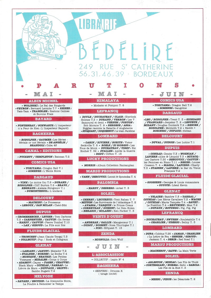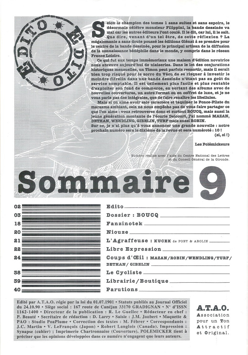 Sommaire : 9 numéros parus de décembre 1990 à juin 1993. Chaque numéro comprend un (ou deux) entretien avec un dessinateur et des informations diverses. Léquipe dirigeante créa ensuite les éditions Le Cycliste. Revue de bonne qualité.