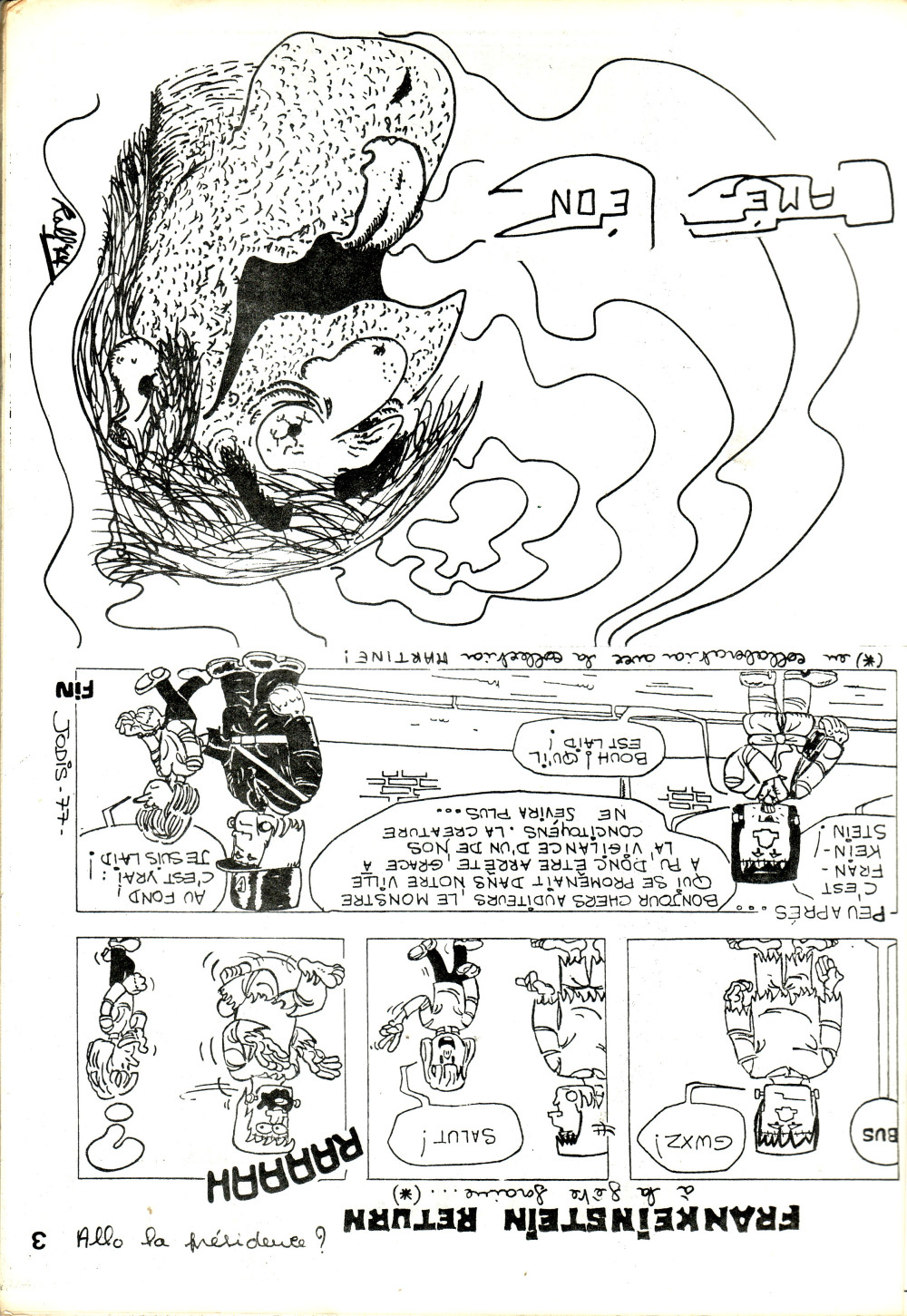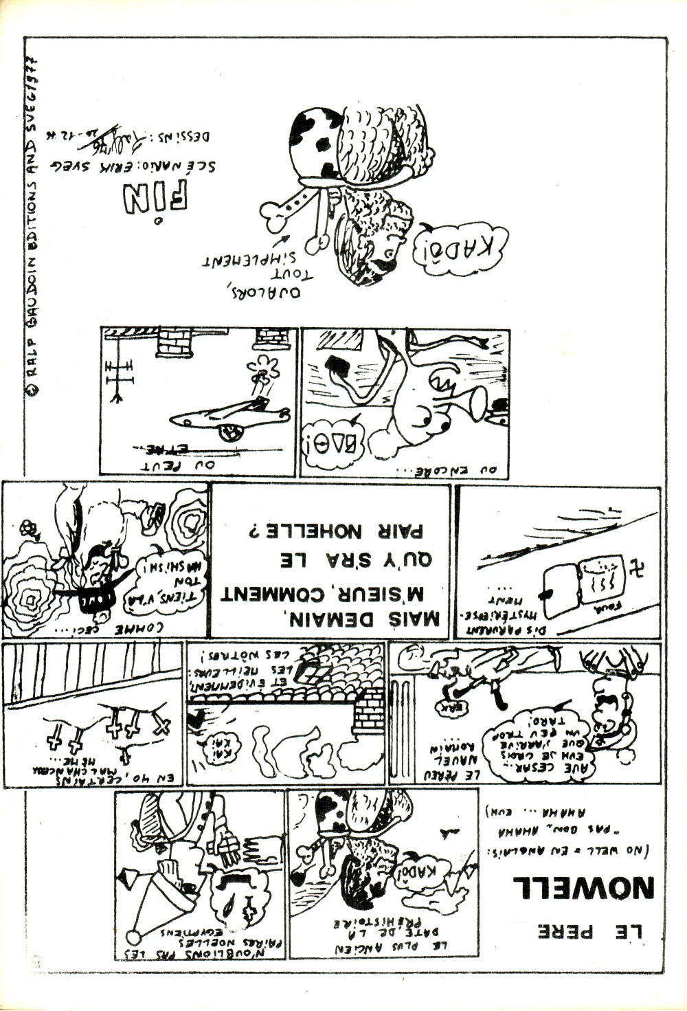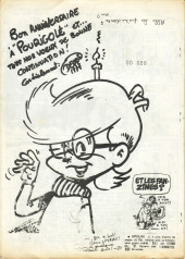 Sommaire : Pas de date de parution mentionnée - novembre/décembre 1976. "Le seul fanzine qui prout-nifavise papa Noël". Directeur de la publication: Francis Land - Conseiller général Ralf Baudouin - Directeur Délégué : Philippe Bercovici - Rédacteur en chef : Francis Land -Rédacteur en chef, adjoint : Prokop -Rédaction : Erik Sveg, M. Polisaro, R. Baudoin et P. Bercovici. Maquette : FR. Land