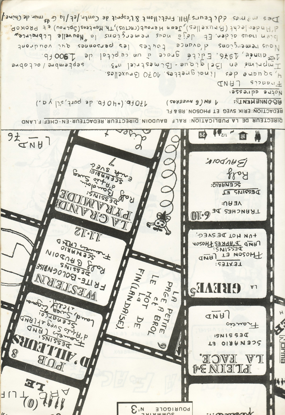 Sommaire : Pas de date de parution mentionnée - septembre/octobre 1976. "Le premier fanzine qui prout-nifavise le cinéma" - Imprimé uniquement au verso (rien au recto). Directeur de la publication: Ralf Baudouin Directeur --en-chef : F. Land Rédaction : Erik Sveg et Phoson, RB &FL. Francis Land, square des linaigrettes 1070 Bruxelles - Edité grâce à un capital de 1.900Fb. Imprimé en Belgique.