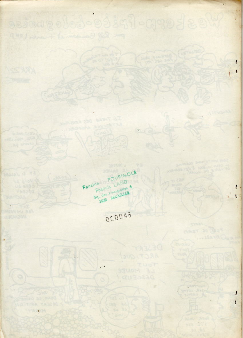 Sommaire : Pas de date de parution mentionnée - janvier-février. "Le fanzine garanti 00% en papier véritable!". Directeur de la publication: Francis Land - Conseiller général Ralf Baudouin - Directeur Délégué : Philippe Bercovici - Rédacteur en chef : Francis Land (applaudissez!) -Rédacteur en chef, adjoint : Prokop -Rédaction : Erik Sveg, M. Polisaro, R. Baudoin et P. Bercovici.,Sakir Vanhe Seho et Lucky Maquette : FR. Land. Reliure = 3 agrafes.
