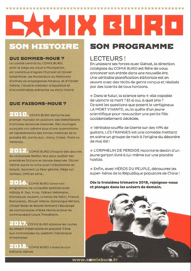 En unissant ses forces avec Glénat,la direction collégiale du COMIX BURO est fière de vous annoncer son entrée dans une nouvelle ère. Une véritable planification éditoriale est en oeuvre avec des récits de genre conçus et réalisés par des talents de tous horizons.