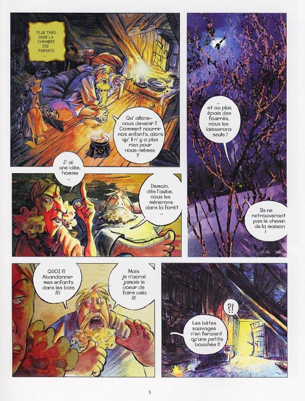 Hansel, Gretel et leurs parents habitent une chaumière à l'orée d'un grand bois. Cette année, une disette s'est abattue sur le pays. Les parents décident alors d'aller perdre leurs enfants dans la forêt... Mais Hansel et Gretel retrouvent leur chemin grâce à des cailloux semés derrière eux. La deuxième tentative sera la bonne : les enfants ont semé des miettes... que les animaux s'empressent de manger ! Hansel et Gretel sont bel et bien perdus...