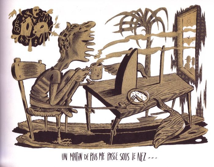 Cet objet graphique non identifié met en scène un style émotionnellement fort : image par image, l’auteur construit son univers empreint de poésie, de force et d’étrangeté par un travail technique de précision et un jeu de couleurs empreints d’une note nostalgique et musicale.