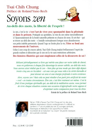 Le zen, c'est la vie : c'est l'art de vivre avec spontanéité dans la plénitude et dans le présent. Pratiquée au quotidien, la voie du zen mène inexorablement à l'épanouissement de la bonté naturelle présente en chacun de nous. Et cet état - qui se trouve au-delà des mots - s'installe normalement lorsque nous abandonnons nos petits intérêts personnels. Quand l'ego ne limite plus la vie, l'être se fond aux mouvements de l'univers. Grâce à son coup de crayon adroit, Tsai Chih Chung traduit brillamment l'esprit des grands maîtres et démontre que le zen est la vie sans restrictions arbitraires. Des histoires illustrées qui sont simplement celles de la découverte de soi !