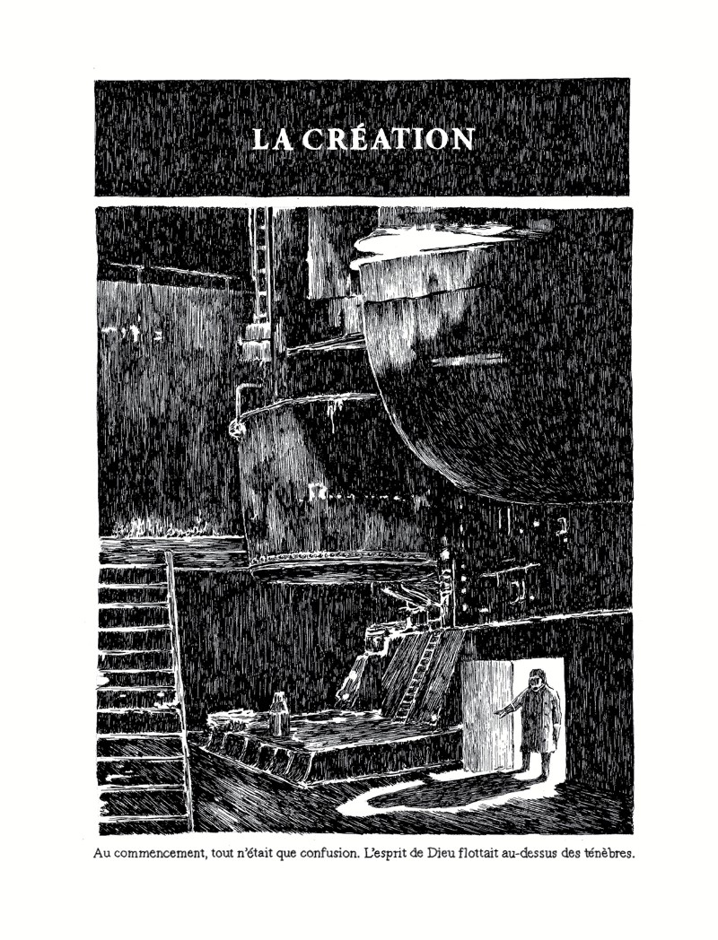 Le Livre réinterprète sept épisodes de l’Ancien Testament : la création du monde par Dieu, le sacrifice d’Abraham, la venue de l’Ange vengeur, les doutes de Job, les lamentations de Jérémie, la prophétie d’Ézéchiel et la punition de Jonas. Ces récits bibliques sont ici désaxés (spatialement et temporellement) et figurés par des animaux. Dans la Création, Dieu est représenté en ingénieur d’une centrale nucléaire. Ézéchiel se réincarne dans un être au croisement d’un minotaure et d’un cadre d’affaires. Le sacrifice d’Abraham se rejoue au sein d’une communauté d’ours blancs au pôle Nord, près de l’épave d’un chalutier pris dans les glaces. Jonas s’est métamorphosé en un loup à bord d’un navire de la Renaissance, etc. Le mélange des symboles ou leur inversion, les références à notre monde contemporain, l’usage des figures mi-homme mi-bête... L'originalité des codes utilisés par Arispe, alliée à un dessin virtuose, réussit à remettre en lumière ce que nous pensions connaître, à nous refaire découvrir de façon sensible, au-delà des croyances, les dimensions poétiques et universelles de l’Ancien Testament.