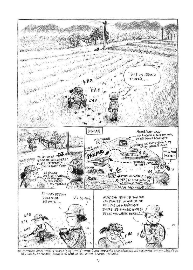 Avant les premières grandes vagues d'immigration chinoise au XVIIe siècle, Taïwan était habitée par des groupes aborigènes, dont les langues et les traditions ont en grande partie disparu. Les Amis sont l'une des tribus qui subsistent sur l'île. En 2013, une amie de la dessinatrice Li-Chin Lin, Hsiao-Ching, décide de s'installer à Dulan, un village Amis de la côte est. Elle y monte un projet de ferme bio et noue rapidement des relations fortes avec les Amis, puis en vient à militer avec eux contre un énorme projet de complexe hôtelier sur la plage toute proche de Fudafudak. Afin de raconter cette histoire, Li-Chin Lin est partie vivre plusieurs mois à Dulan avec Hsiao-Ching et les Amis. À travers le récit de leur quotidien, elle montre comment une minorité longtemps opprimée par le gouvernement tente envers et contre tout de préserver ses coutumes et son cadre de vie, face à des autorités locales obnubilées par des intérêts financiers.