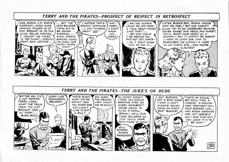 Au cours de leurs aventures en Chine, Pat et Terry ont été rejoints par le pilote Dude Hennick et le philanthrope Raven Sherman. Après que Raven ait été tué par le sinistre capitaine Judas, il y eut un tollé national de la part des fans du comic strip, preuve que Terry et les pirates, et les bandes dessinées en général, avaient trouvé une place dans le cœur des lecteurs de journaux.