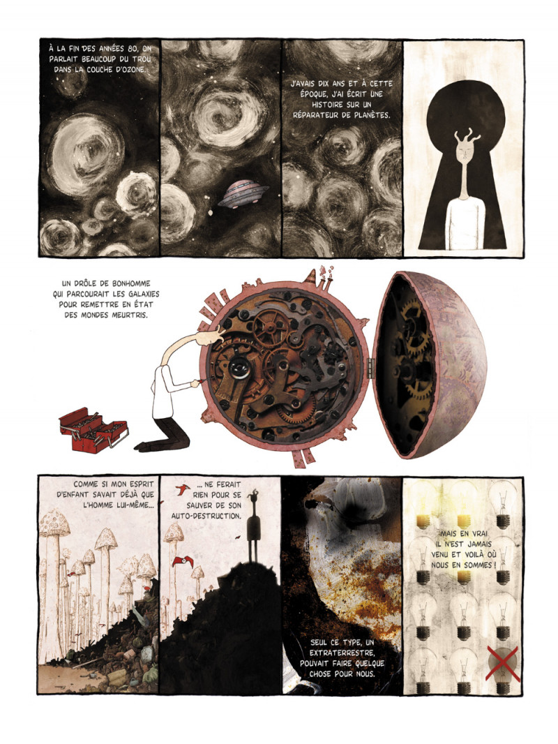 En évoquant avec sincérité et pudeur l’itinéraire de ce personnage secret dont on ne fait qu’entrevoir le visage, Baya observe avec justesse et courage nos lendemains qui déchantent. Méditation sur la nature humaine, cette bande dessinée est aussi un magnifique exercice de liberté graphique.