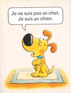 "Regarde le chat. - Je ne suis pas un chat. Je suis un chien. - Regarde le chat bleu. - Je ne suis PAS bleu et je ne suis PAS un chat. - Le chat bleu porte une robe verte. - Je n'ai pas de robe verte !"