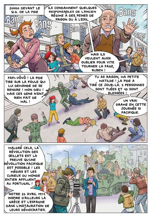 En ce 25 avril 2024, Ruben et Matilde sont chez leur papi-vôvô (leur grand-père portugais). Intrigués de voir TF1 relayer des images sur les grandes célébrations de la journée au Portugal, ils demandent à leur papi pourquoi les TV françaises parlent du Portugal, chose qu´elles ne font que rarement ! Commence alors le récit de papi et un voyage dans le temps pour les enfants : la dictature de Salazar, la guerre dans les colonies et le coup de d´Etat organisé par un petit groupe de jeunes militaires. Papi-vôvô et les enfants suivent les pas du Capitaine Salgueira Maia pendant toute cette journée décisive qui mettra fin à plus de 40 années d´oppression et mènera les Portugais vers la liberté ! Le 25 avril 1974, c´était hier. Les grands-parents de Ruben et Matilde ont bien connu la dictature car c´est elle qui les a menés en France. Nés en France et au Luxembourg, Matilde et Ruben vont commencer à comprendre ce qu´était leur vie sous Salazar, le dictateur.