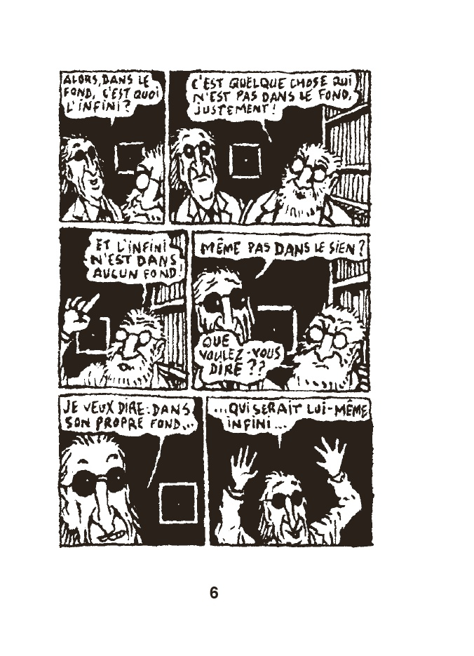 Défini par l'auteur lui-même comme « ...une folie, au sens architectural du terme », cet ouvrage, réalisé au format de publication (chaque original occupant un espace de moins de 2 cm2) met en scène deux personnages, l'un physicien, l'autre philosophe, glosant sur les caractéristiques de l'infini, et plus particulièrement sur celles liées à l'infiniment petit.