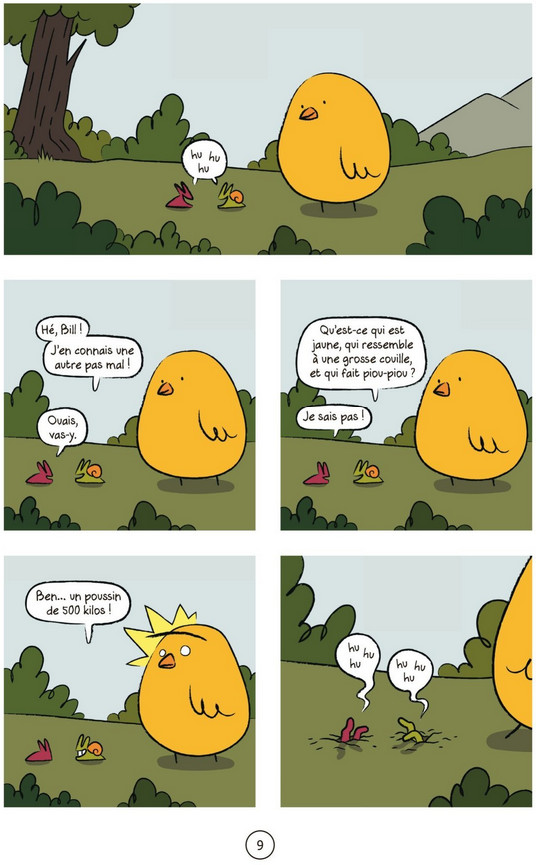 Le bestiaire, familier, est aussi unique en son genre : un lapin convaincu de faire régner la terreur, un duo d'escargots et de limaces toxicos, un poussin de 500 kilos qui ne connait pas sa force (ni son poids), une famille de Beloups (mi-belette, mi-loup) persuadée d'être les prédateurs ultimes, un ornithorynque naïf... qui font de ce décor de comptine un récit irrésistiblement et cruellement drôle.