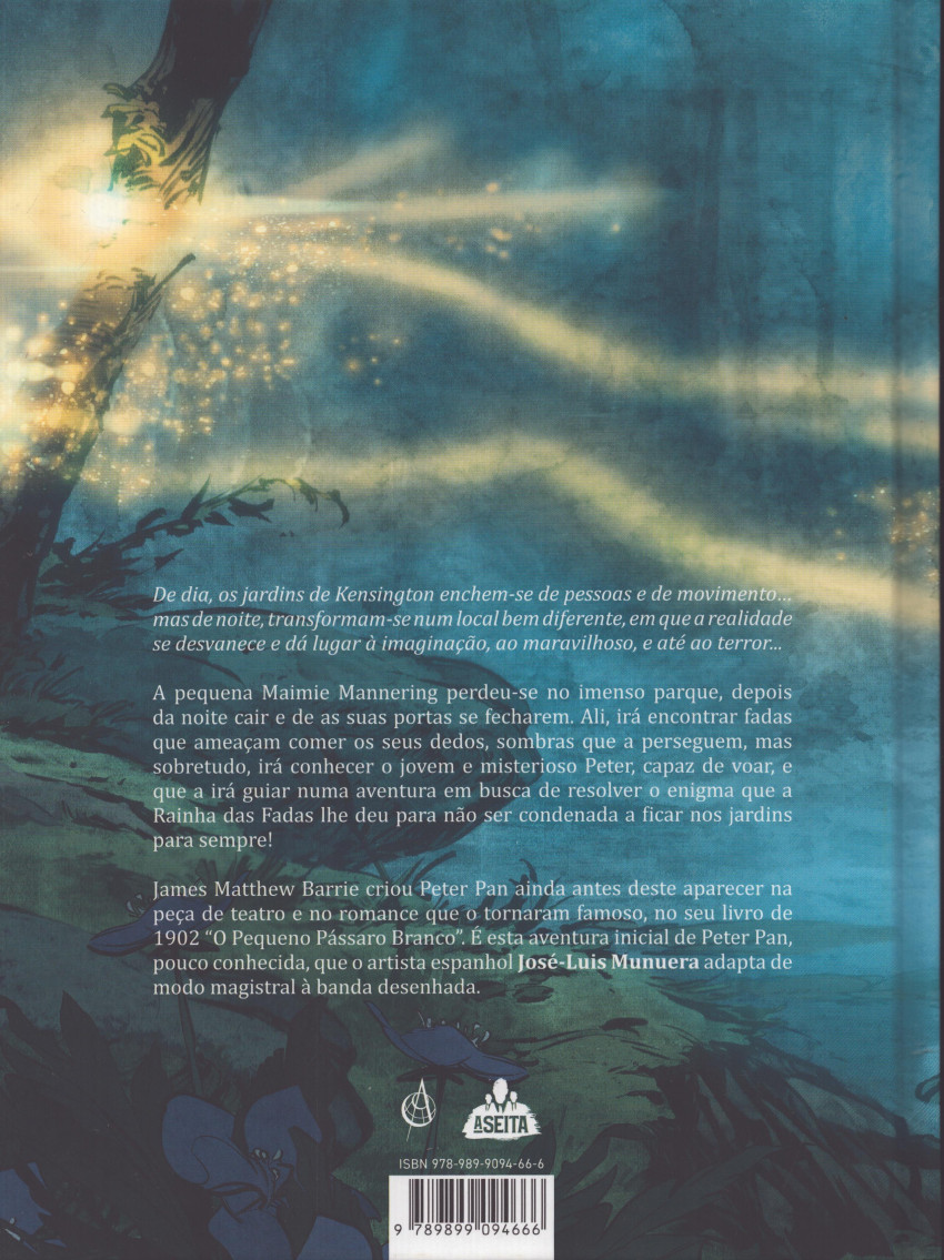 À noite, já nada é como antes. A realidade desaparece, dando lugar à imaginação. Durante o dia, os Jardins de Kensington, em Londres, enchem-se de gente. Mas, ao cair da noite, transformam-se num reino de maravilhas... Maimie Mannering, de seis anos, perde-se neste vasto parque depois do fecho dos portões. Encontra fadas que ameaçam "comer os seus dedinhos" e, depois, conhece um certo Peter Pan. Um rapaz estranho, este Peter. Capaz de voar, conta a Maimie sobre "uma terra imaginária, uma ilha onde as crianças nunca crescem". Maimie anseia por voltar para casa. Mas Peter quer que ela fique com ele e se divirta. Juntos, vão encontrar a Rainha das Fadas e tentar resolver um enigma improvável que permitirá a Maimie encontrar a saída do parque antes do amanhecer, altura em que ficará lá presa... para sempre! Antes de encenar Peter Pan numa peça de teatro em 1904 e, mais tarde, no romance Peter e Wendy, publicado em 1911, James Matthew Barrie criou a personagem em 1902 noutro romance, O Pequeno Pássaro Branco. José-Luis Munuera adapta este texto até então esquecido, oferecendo uma visão da personagem que é ao mesmo tempo pessoal e fiel à obra do escritor.