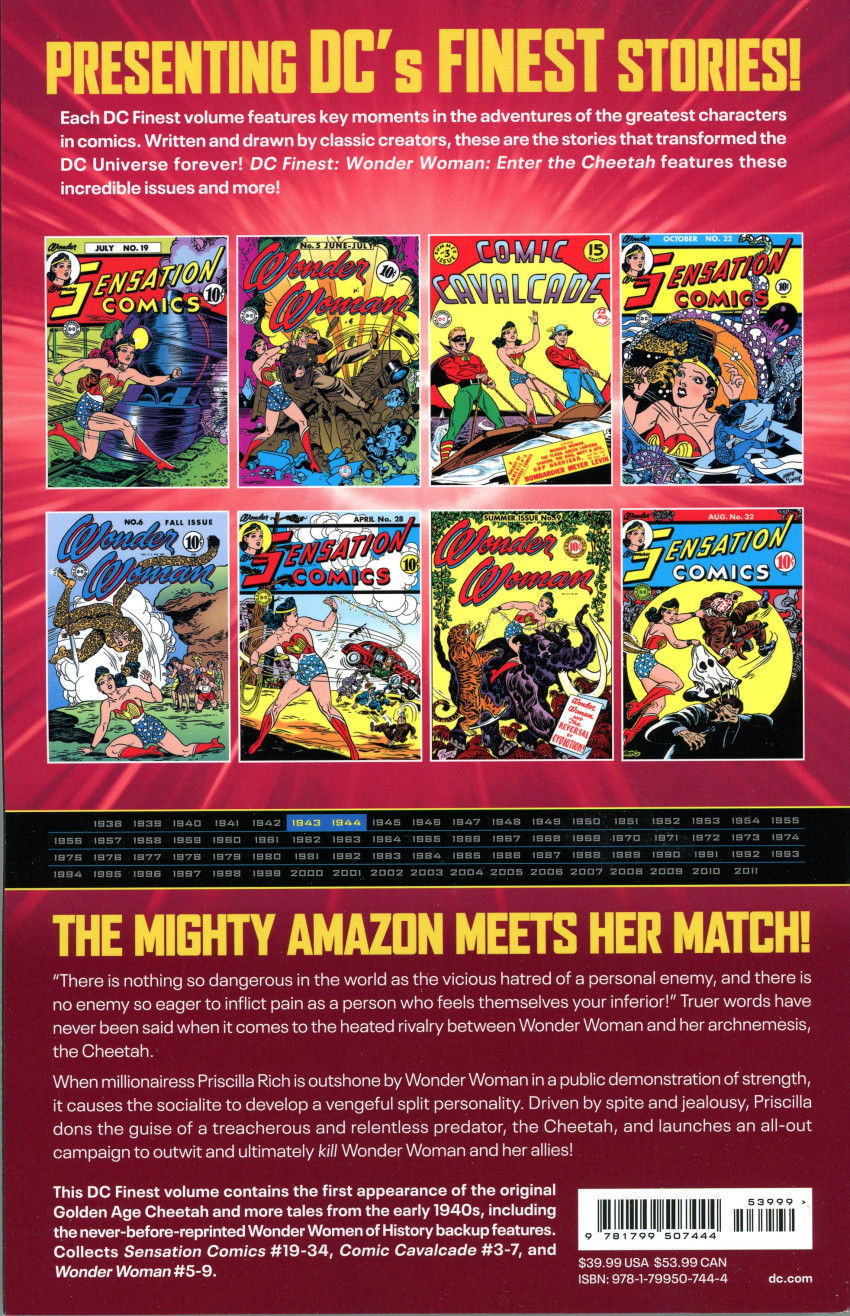 Info édition : Contient les histoires de Wonder Woman issues des albums "Comic Cavalcade (1940)" n°3 à 7, "Sensation Comics (1942)" n°19 à 34 et "Wonder Woman Vol.1 (1942)" n°5 à 9, complétées respectivement de leur couverture originale. Mention "12/19/25. First Printing".